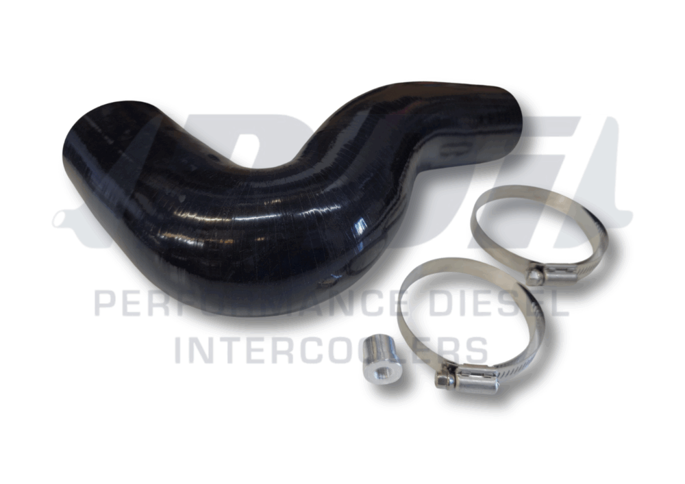 A 5 layer reinforced silicon pipe for installing a CT26 based turbo on a 1HZ with the standard intake crossover in place. Makes the joining of the outlet from turbo easy.